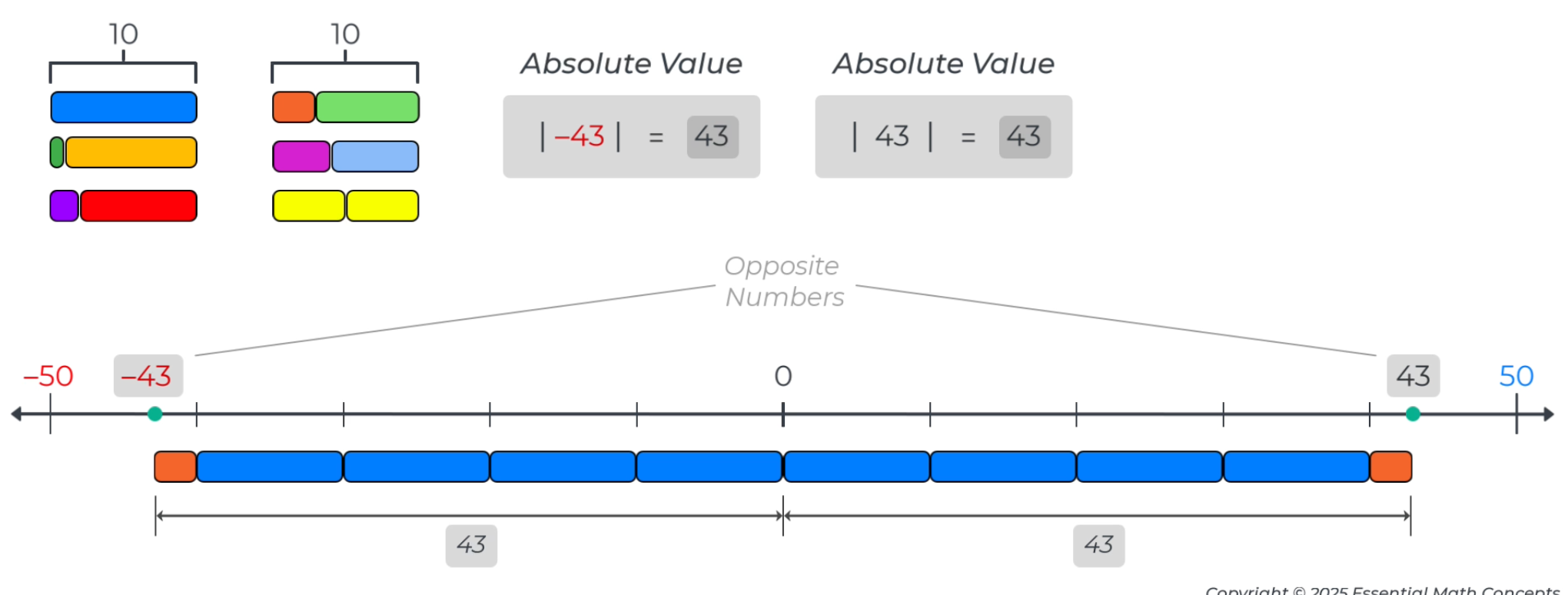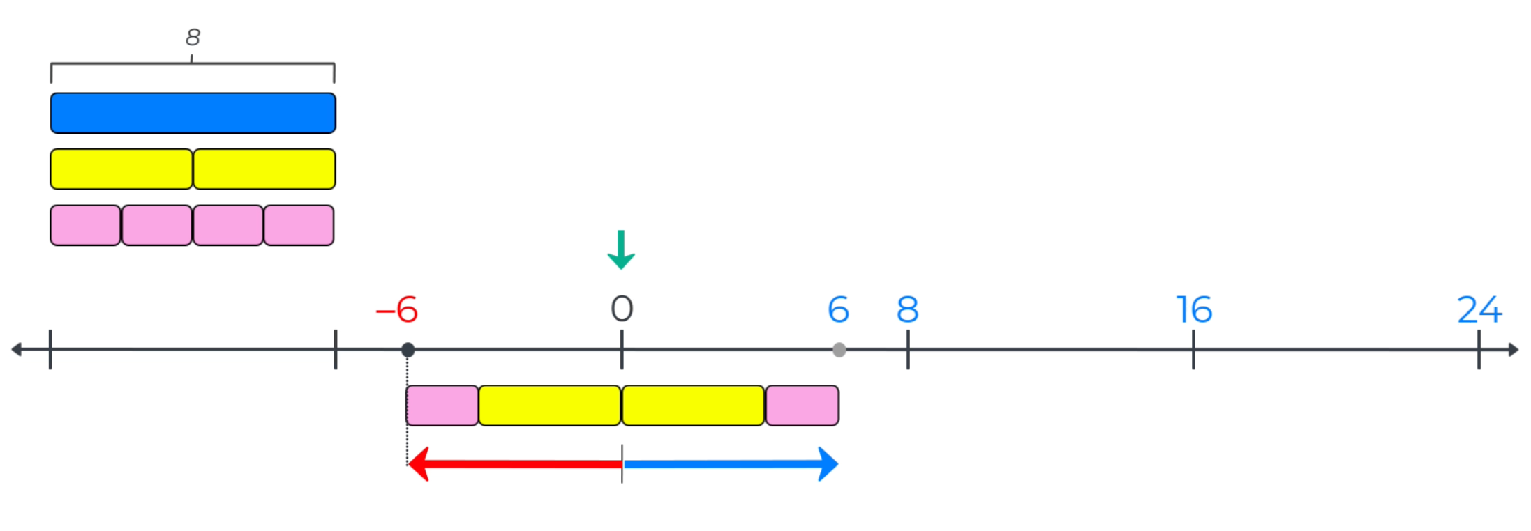 So, the measurement strategies used to locate and label whole numbers to the right of zero in grades 3-5 are used in grade 6 to plot positive integers to the right and negative integers to the left of zero. In addition, since the bars measure distance to both the right and left of zero, the length of a set of measurement bars used to measure from zero can be introduced as the absolute value of a number.