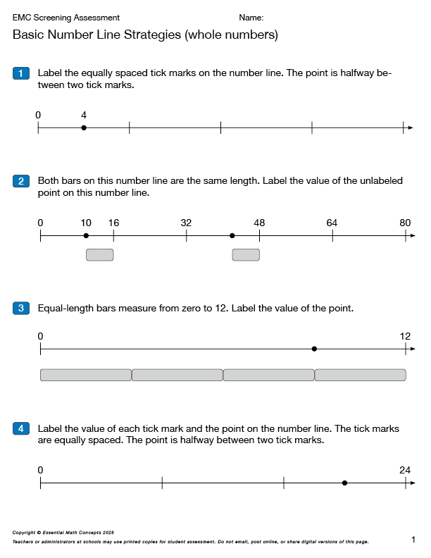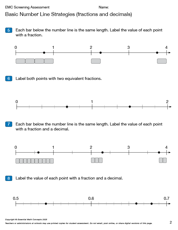 This 8-question screening assessment can be used to identify which basic number line strategies students are bringing with them into middle school. Students will need these number line strategies with whole numbers, fractions, and decimals to be prepared to represent rational numbers on number lines in grades 6 and 7.