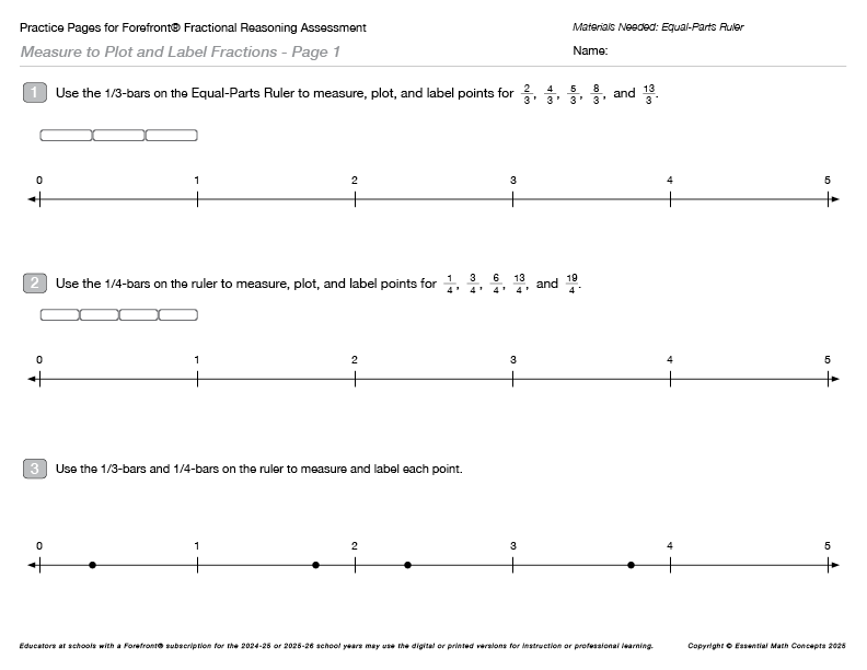 Note that Magnetic Manipulative Kits for number lines can be purchased from Essential Math Concepts. These kits include foam measurement bars that are easy for students to line up end-to-end to accurately measure fractions on number lines. These kits also include magnetic number line strips that allow teachers to quickly and accurately build a number line on a 48-inch whiteboard.