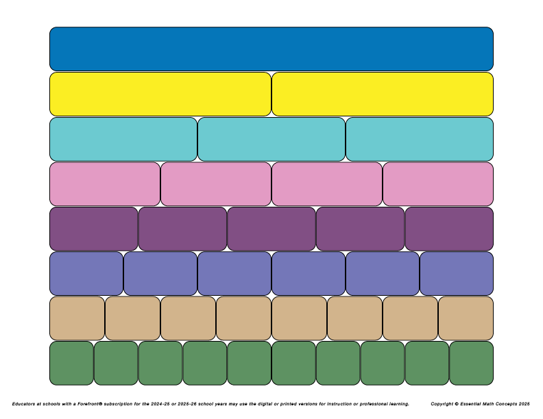 Note: Only print two copies of the fraction bars if you use the printed versions of the manipulative kit. This will require students to use the fraction strip to skip-count by fractions equivalent to whole numbers. Repeatedly applying this skip-counting strategy will help prepare students to understand strategies for converting mixed numbers to fractions and vice versa.