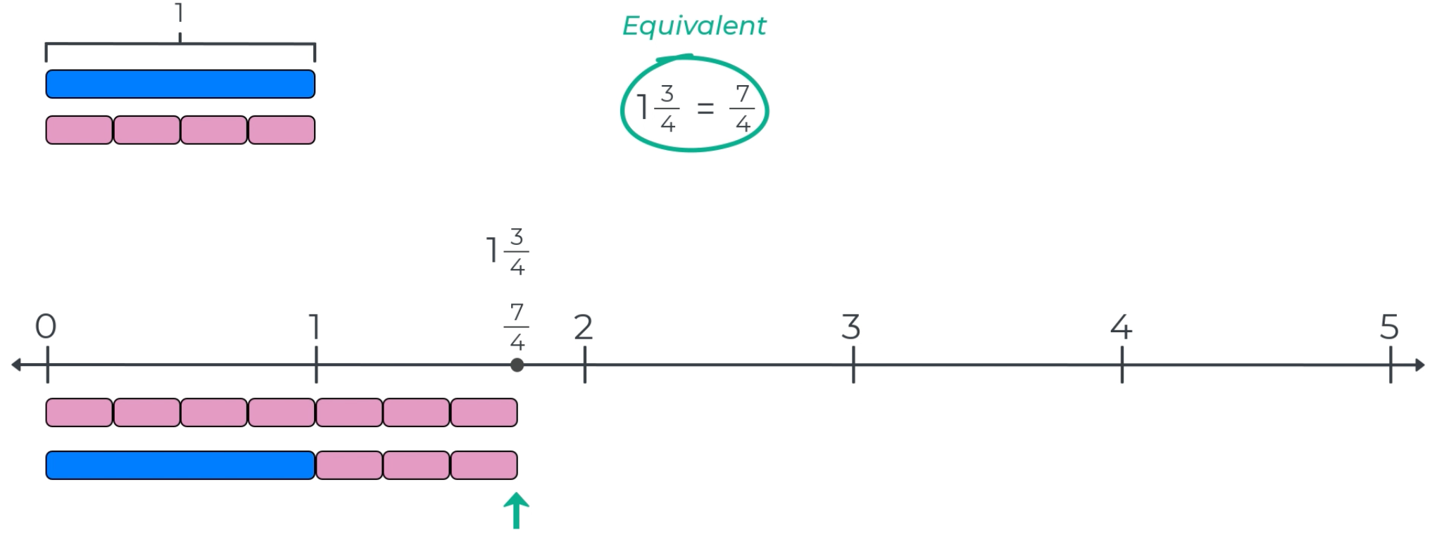 In the example below, seven 1/4-bars are used to measure from zero to 7/4 on the number line. Then, a 1-bar and three 1/4-bars are used to measure and label the same point as 1 3/4. Since both numbers measure from zero to the same point, 7/4 is equal to 1 3/4.