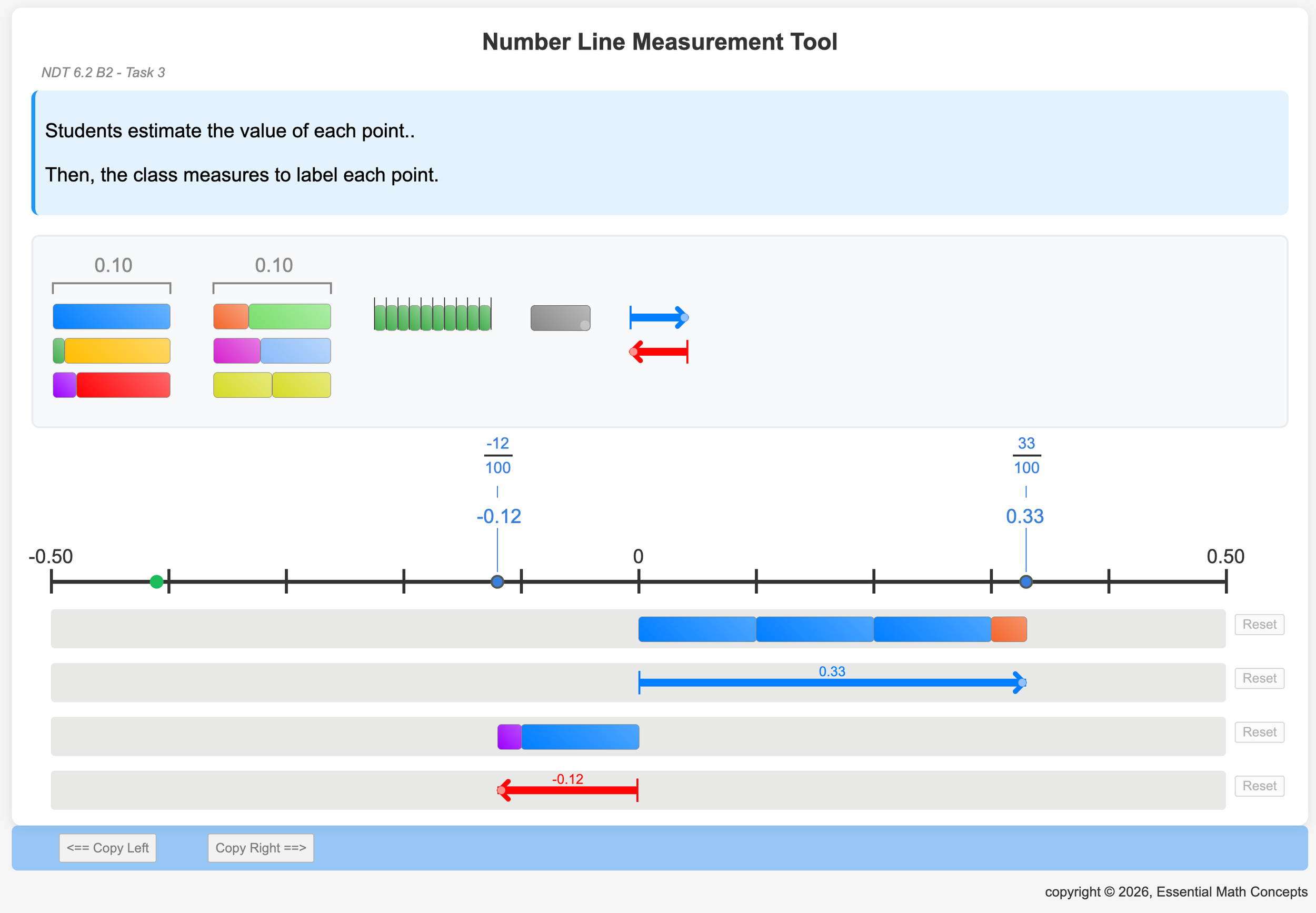 NDT Videos introduce basic representations, strategies, and concepts to small groups or classes of students. Then, these videos present a series of group Challenges that ask students to represent numbers and solve problems using a set of magnetic measurement bars on a whiteboard or using the online interactive Number Line Measurement Tool.