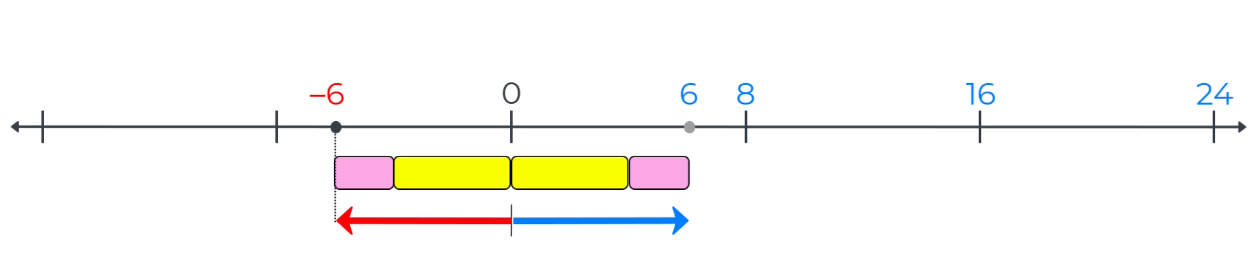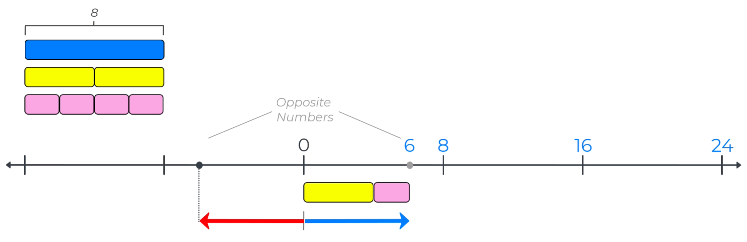 Notice that measurement bars will be particularly useful when demonstrating that taking the absolute values of opposite numbers results in the same positive number, because distance is always defined as a positive number. Arrows, on the other hand, represent positive and negative numbers because arrows are defined by length (distance) and direction of the arrow.