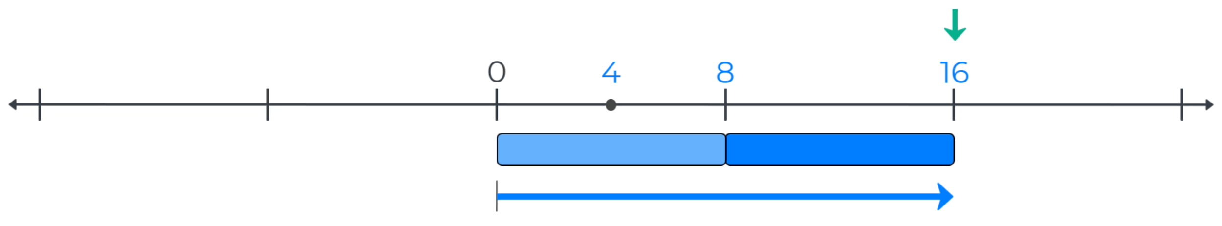 Next, a blue bar that measures the length of two yellow 4-bars is added to the measurement key for this number line. The length of the blue bar is found by adding the lengths of the two 4-bars to get 4 + 4 = 8.