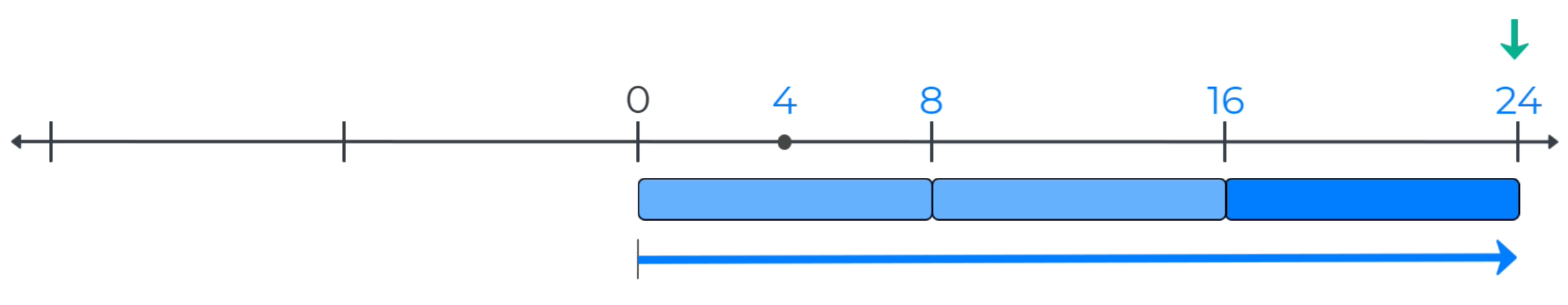 Student can use additional measurement bars to apply measurement strategies to label points on a numbe line. They should e encoraged to use multiple strategies such as measuring the distance from zero and nearby labeled tick marks (e.g., measuring a 2-bar to the left of the tick mark for 24 locates the point for 24 - 2 = 22).